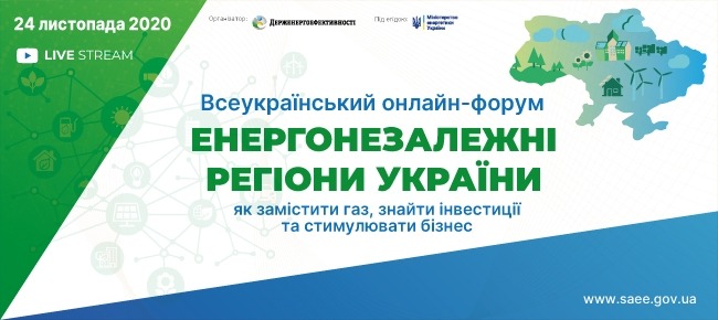 24 листопада 2020 р. відбудеться  широкомасштабний Всеукраїнський онлайн-форум «Енергонезалежні регіони України: як замістити газ, знайти інвестиції та стимулювати бізнес», ініційований Міненерго та Держенергоефективності