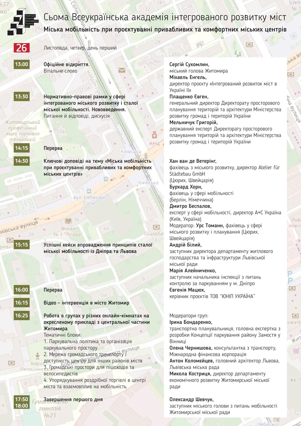 Тема Академії - Міська мобільність при проєктуванні привабливих та комфортних міських центрів. Досліджуватимемо кейси із Житомира за фахової модерації українських і міжнародних експертів.