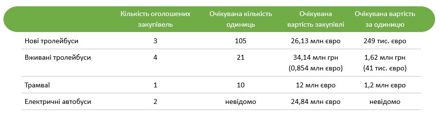 Найбільше міста закуповують нові тролейбуси та трамваї. Декілька закупівель стосуються вживаного рухомого складу тролейбусів та нових батарейних автобусів.