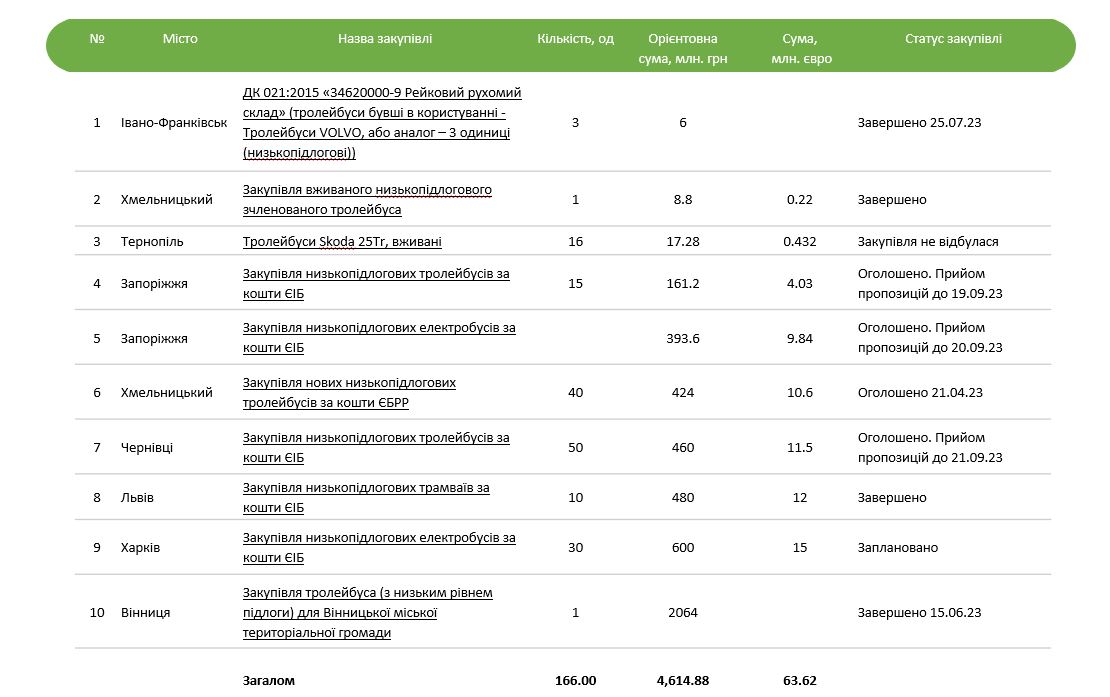 Детальніше зі списком закупівель електричного громадського транспорту містами України можна ознайомитися нижче. Зауважимо, що цей список може бути не вичерпним і якісь закупівлі не потрапили в наш моніторинг.