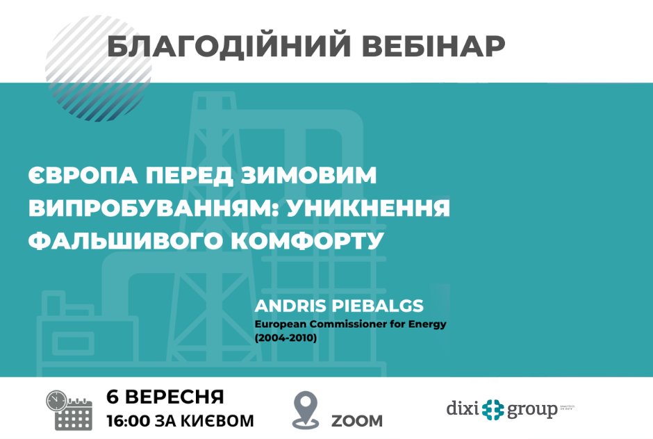 DiXi Group, Kyiv School of Energy Policy та Українська Енергетика проводять благодійний вебінар «Європа перед зимовим випробуванням: уникнення фальшивого комфорту» за участі латвійського політика та дипломата, колишнього Єврокомісара з питань енергетики Андріса Пієбалгса.