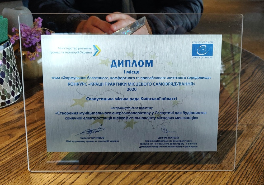 Суперництво в конкурсі було гідним, однак Славутицька міська рада була визнана однією з кращих і отримала Диплом І ступеня та нагороду «Кристал» у номінації «Формування безпечного, комфортного та привабливого життєвого середовища» з практикою «Створення муніципального енергокооперативу у Славутичі для будівництва сонячної електростанції шляхом спільнокошту місцевих мешканців».