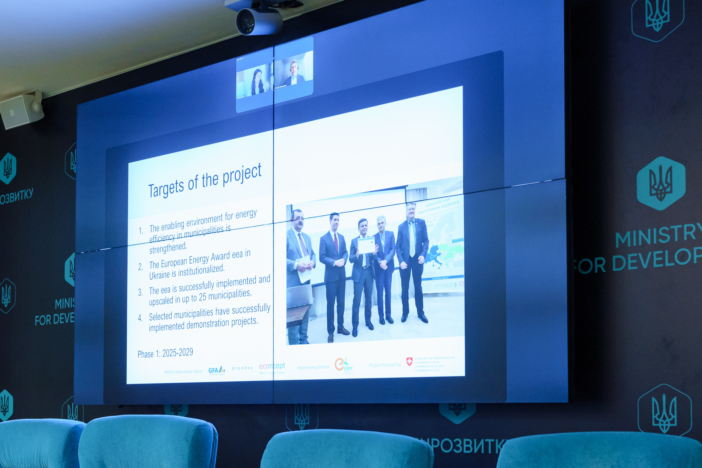 До засідання долучилися представники Мінрозвитку, Державного секретаріату з економічних питань Швейцарської Конфедерації (SECO), Посольства Швейцарії, Асоціації “Енергоефективні міста України” та експерти міжнародного консорціуму у складі GFA Consulting Group, Brandes Energie, Econcept. Сторони затвердили підхід до відбору громад для участі у проєкті, обговорили подальші плани впровадження Європейської енергетичної відзнаки (ЄЕВ) в Україні та озвучили можливості для міст-учасників.