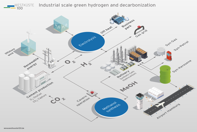 Мал. 1 ілюструє можливість поєднання секторів у промисловості за допомогою водню на прикладі проекту "Westküste 100".