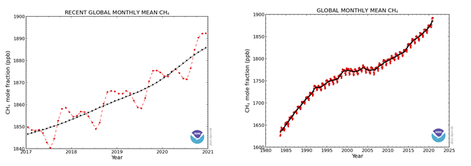 Місячний вміст метану в атмосфері в середньому у світі. Зліва: тенденція 2017-2021 років. Праворуч: тенденція 1983-2021 років. Джерело: NOAA