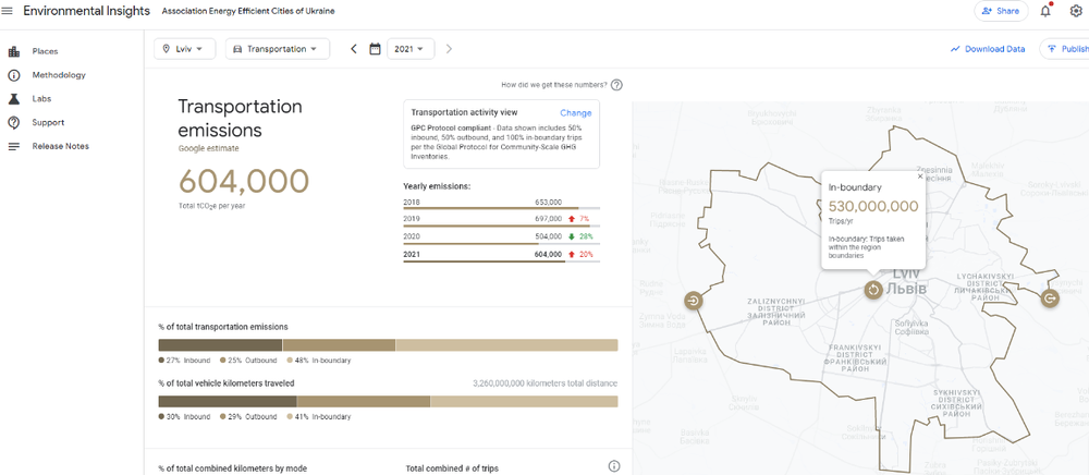Environmental Insights Explorer (EIE) є безкоштовним інструментом Google. Окрім викидів від транспорту ця плаформа дозволить громадам: