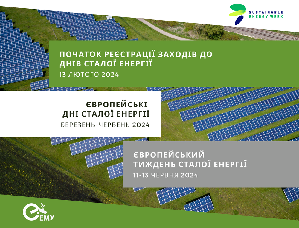 Українські громади можуть зареєструвати свої заходи до Днів сталої енергії з 13 лютого 2024 року. Європейські Дні сталої енергії пройдуть з березня по червень 2024 року.